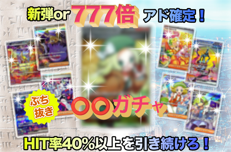 | 希望イメージ | ・各カードが豪華に見えるように ・真ん中にメインキャラクターのカードを大きく表示 ・2つの敵対するグループがわかるように表示 (グループ①:未来イメージ、グループ②:古代イメージ) ・文字は「777倍」「○○ガチャ」はインパクトが出るように表示 |